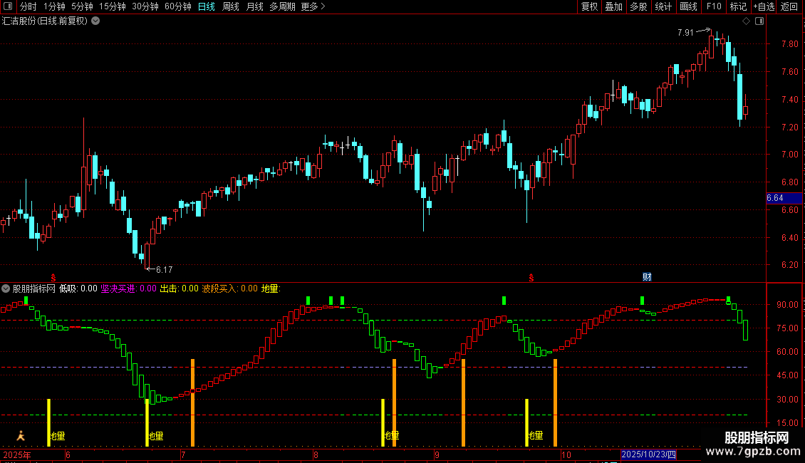 地量:DRAWTEXT(CROSS(0.9,1/VOL*1000>0.01 AND J<0),L*1,'地量'),COLOR00FFFF;