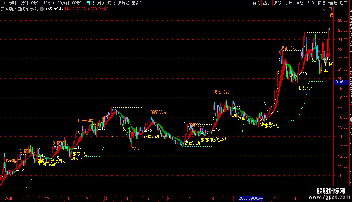 1. 看多信号:出现“涨停启动”“见底”“∠45”提示,且趋势线上穿0轴、KDJ的J值低位金叉时,是低吸布局时机;