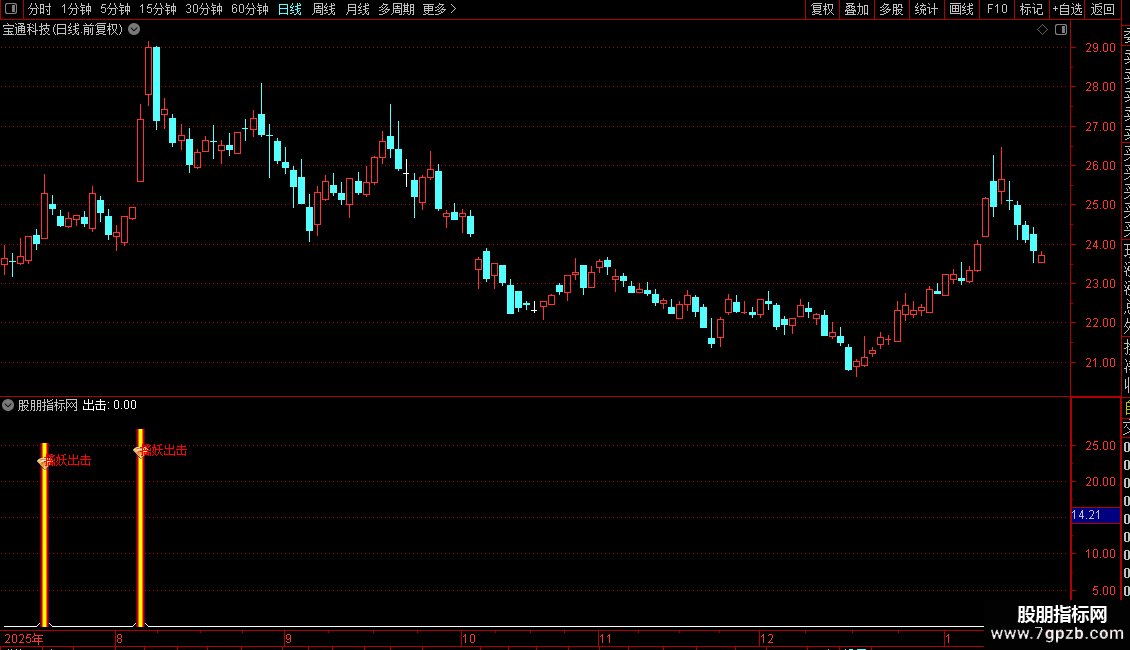 指标主要用于识别具备强势启动特征的个股。其策略核心是在股价经历低位盘整、前一日未涨停、当日开盘涨幅不过大且成交量明显放大的背景下,捕捉出现大阳线突破并站稳多条均线的买入信号。系统通过多重条件过滤,排除一字涨停或高开风险,聚焦于安全边际较高、动能充沛的“擒妖”机会,并在满足条件时给出明确的视觉提示。