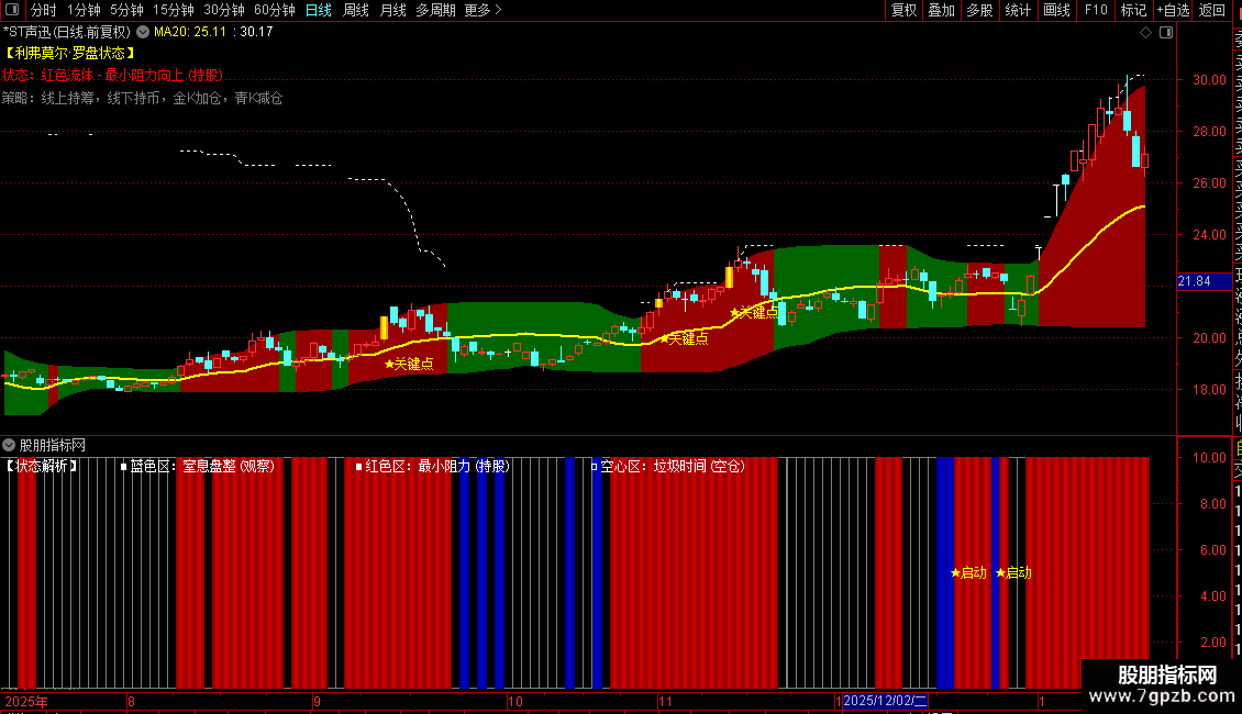 功能:独创的色块指标。蓝色代表“蓄势(盯盘)”,红色代表“主升(持股)”,灰色代表“垃圾时间(休息)”。