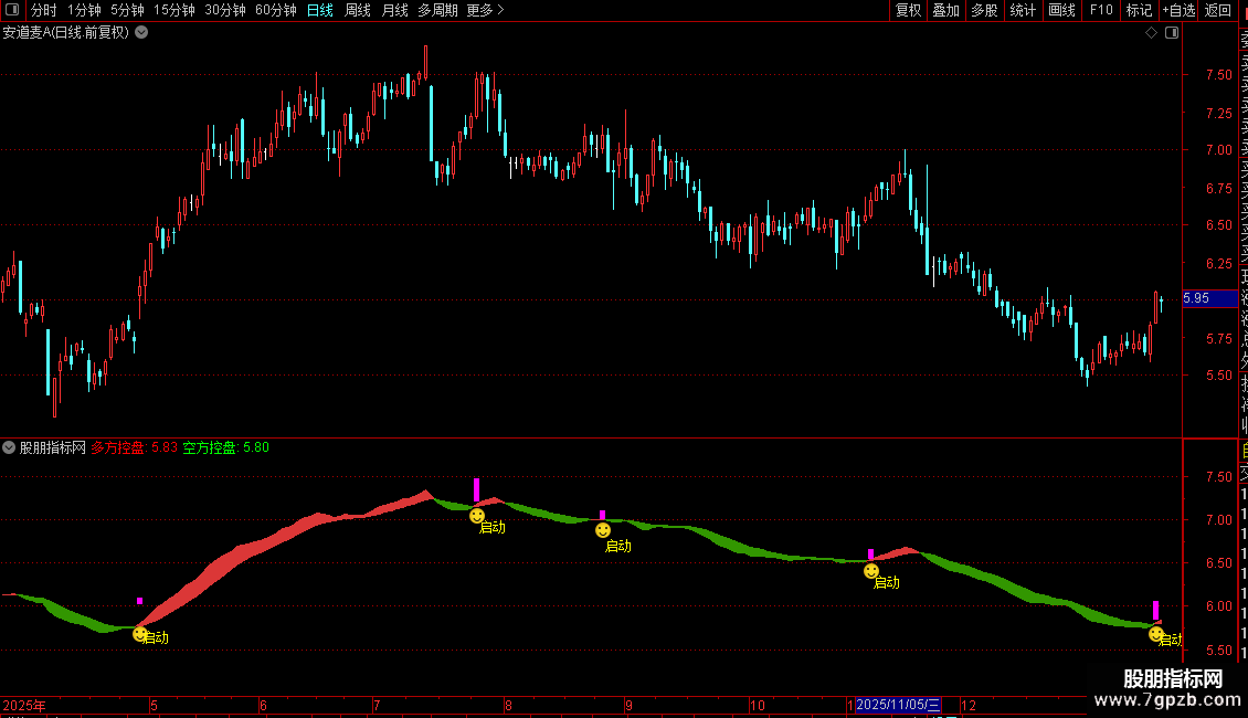 控盘启动精准预警:当紫色K线与笑脸图标同时出现,代表多方控盘力度增强,主升浪启动概率大幅提升,是即时布局的明确信号。
