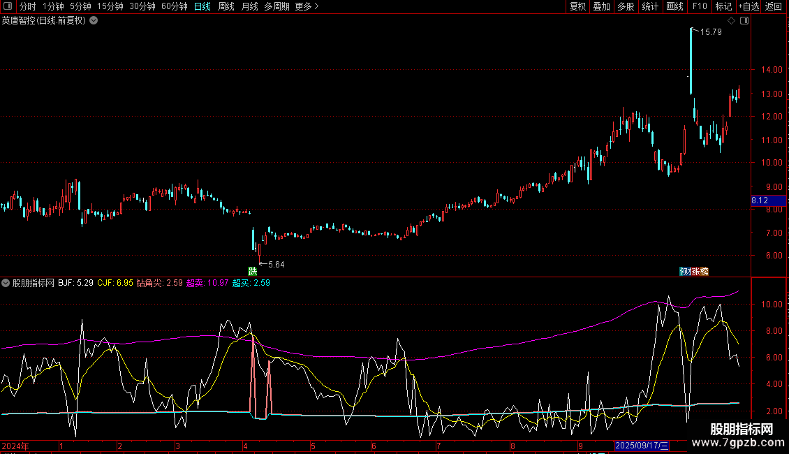 钻角尖:POW((JRB/5-REF(JRB/5,1)),8)*8000+JRB/5,COLORLIRED,LINETHICK2;
