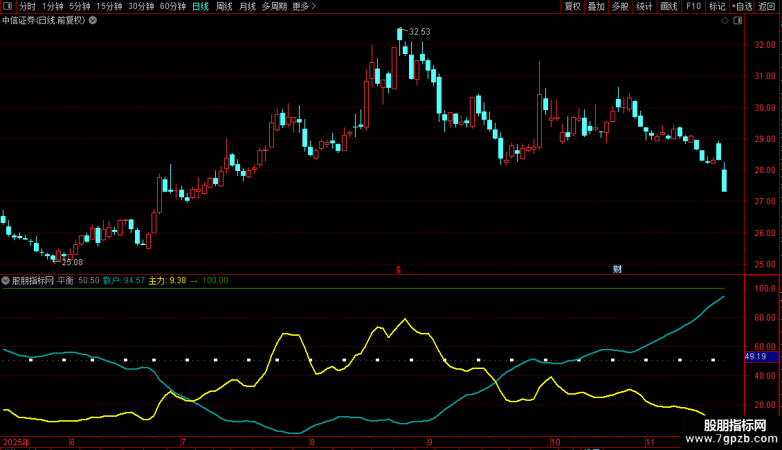 DRAWICON(CROSS(主力,散户) AND 主力>50,平衡,25);