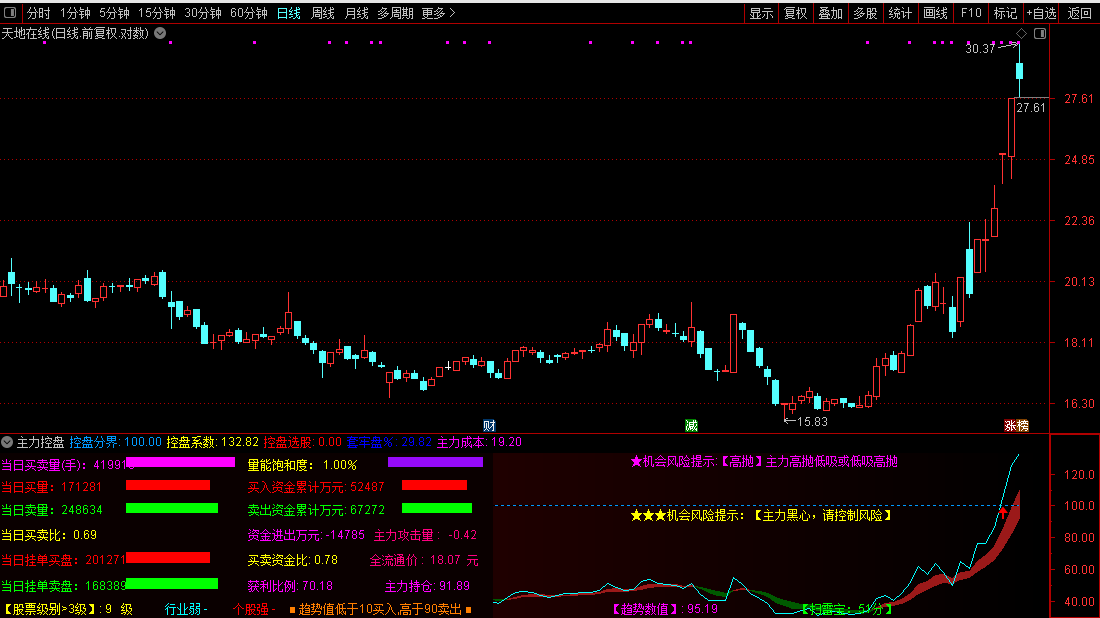本公式是通达信专用主力控盘副图指标,整合控盘系数、资金动向、量能分析、筹码分布、趋势判断五大核心维度,通过彩色柱形、数值标注、文字提示、信号图标多形式呈现数据,同时融入安全分、三强共振、主力成本等关键信息,一站式捕捉主力控盘痕迹,直观反映个股资金博弈、筹码结构与趋势强弱,兼顾分析全面性与操作指导性。