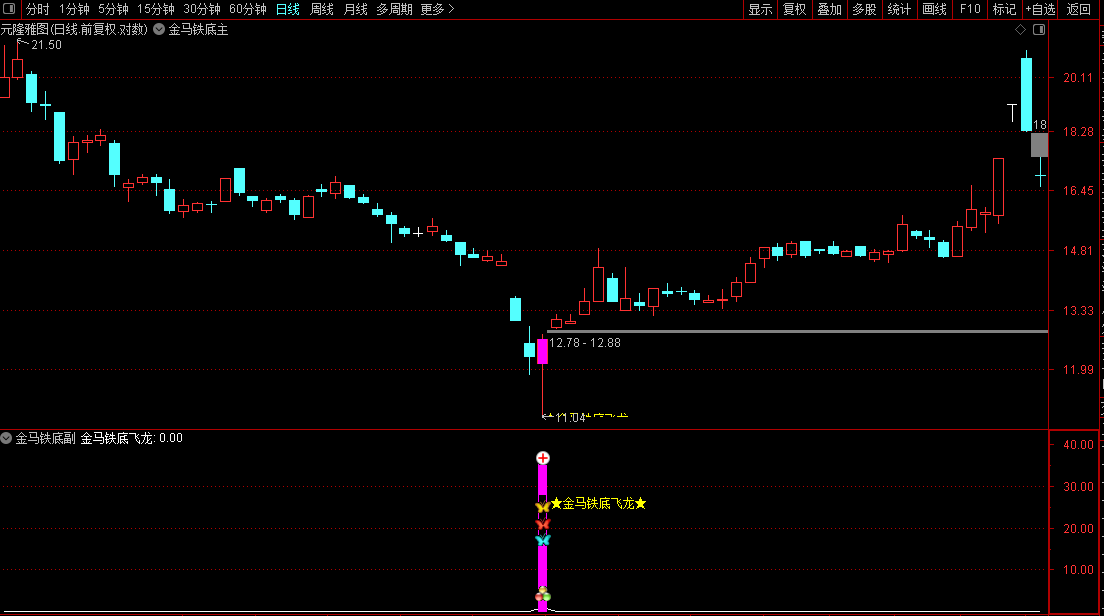 金马铁底飞龙指标是一款专为捕捉股价深度回调后的强势反弹信号而设计的量化指标,底部成功率很高,信号较少且比较集中,往往信号出现时就是大底部。
