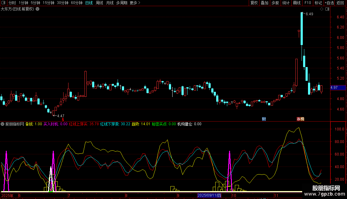 买入时机: IF(CROSS(J,3),65,0),COLORFF00FF,LINETHICK3;