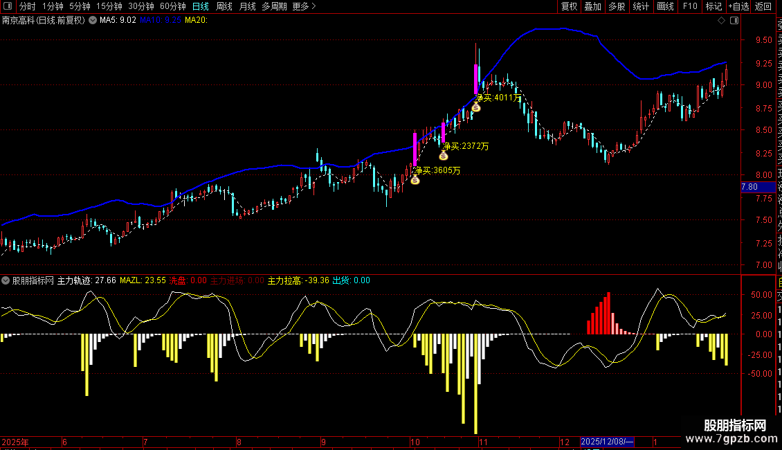 输出MAZL:主力轨迹的N2日简单移动平均,画黄色
