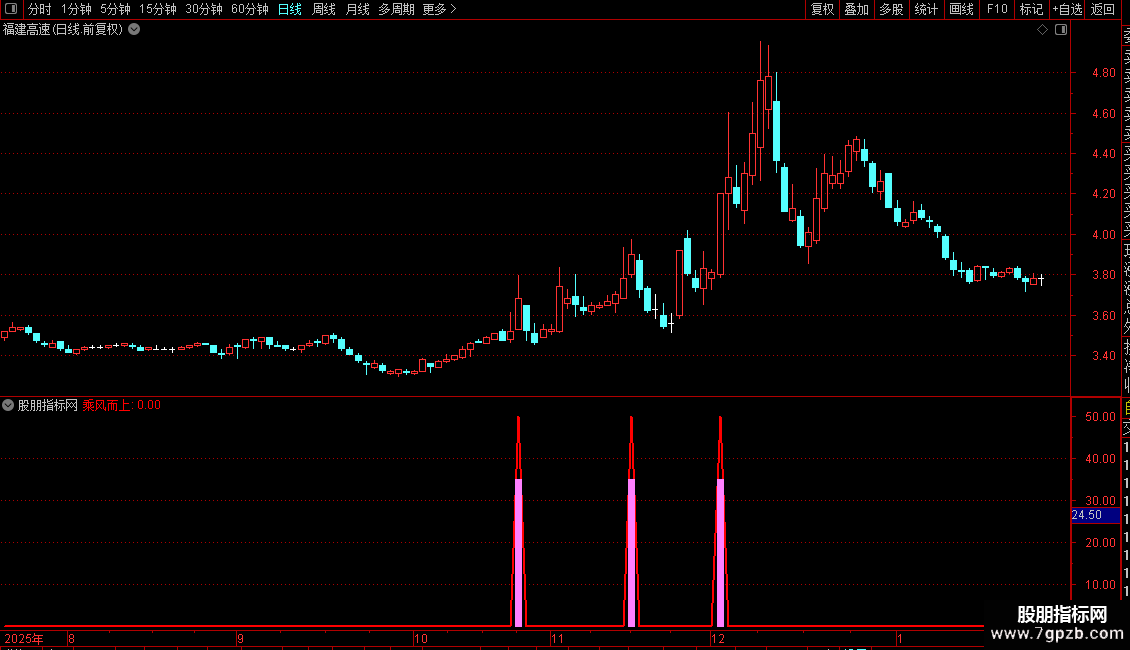 1. 指标副图中出现蓝色柱状(数值50)、粉色柱体叠加黄色“★乘风而上”图标时,为明确买入信号,代表个股符合上升趋势且短线启动条件;