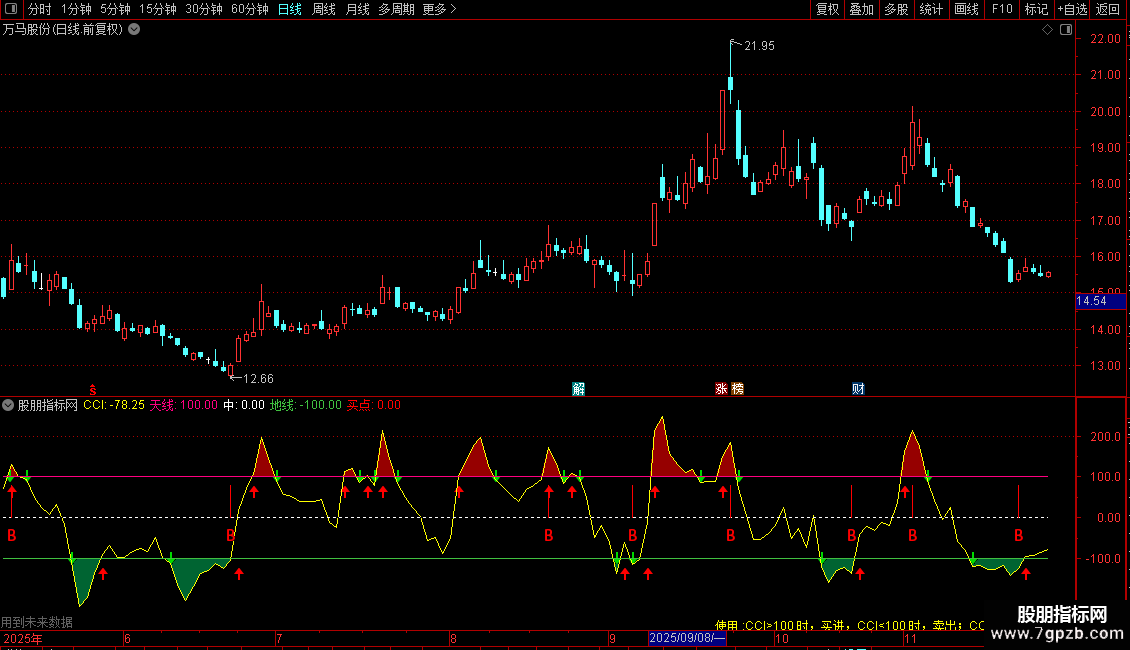 DRAWTEXT(CURRBARSCOUNT=45,-400/1.5,'使用 :CCI>100 时,买进,CCI<100 时,卖出;
