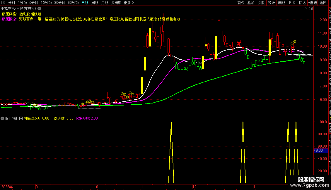 神奇涨5天:IF(X_35 AND X_40 AND X_41 AND X_42 AND X_43 AND X_46,100,0),COLORYELLOW,LINETHICK2;
