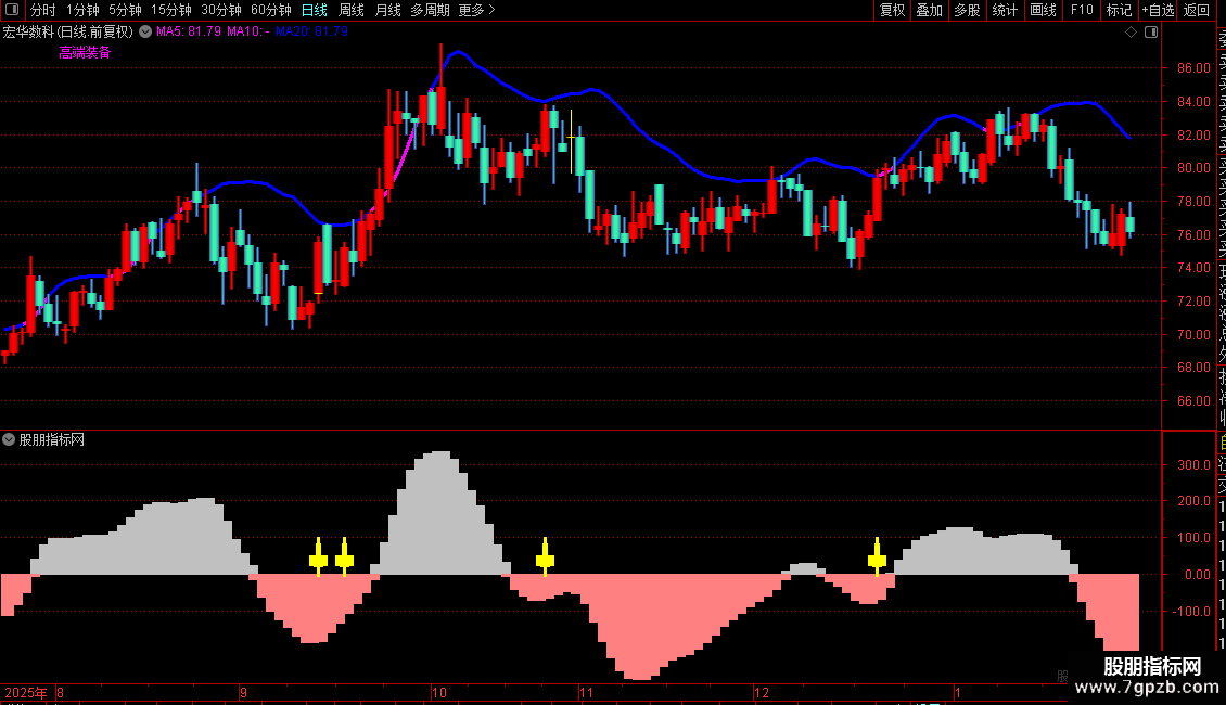 副图指标融合多周期均线穿越、量能放大及价格动能,形成共振信号,黄色爆发柱状图直观提示买入时机。