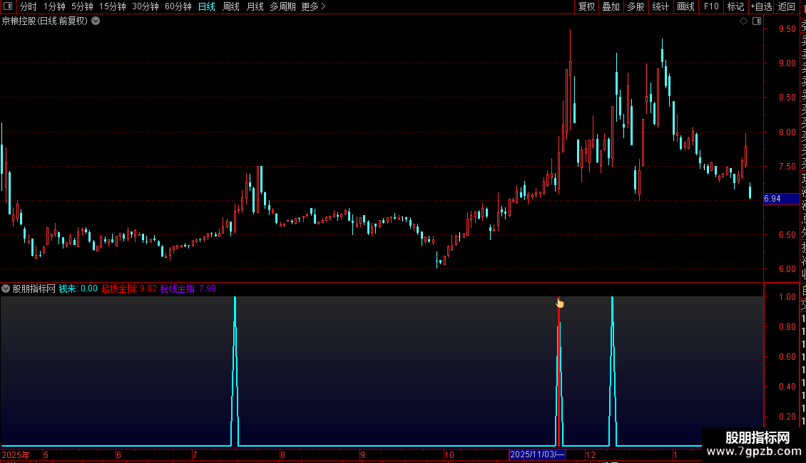 2. 关键压力突破:自动识别30日高点、阶段性高点形成的压力位(起拔金指、秘线金指),当股价向上突破这些关键压力位时,会以红/洋红色柱+图标提示,明确突破信号。