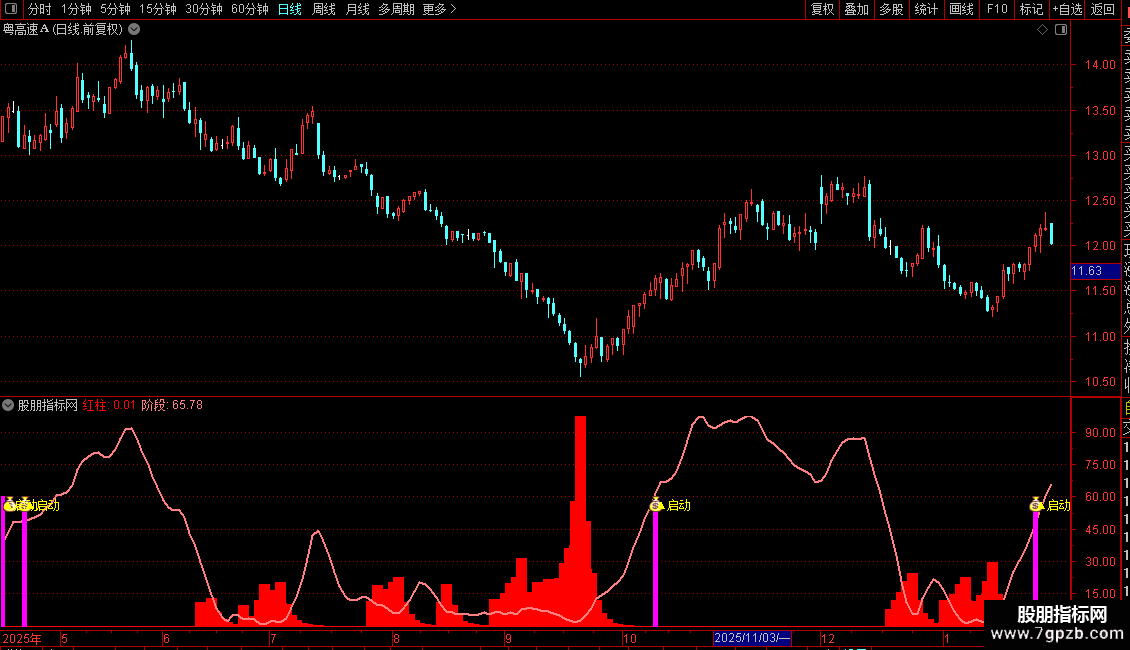 2. 紫色柱子预示启动在即,处于行情启动的临界点——意味着吸筹完成,多头蓄势待发,可筛选即将进入主升浪的标的。