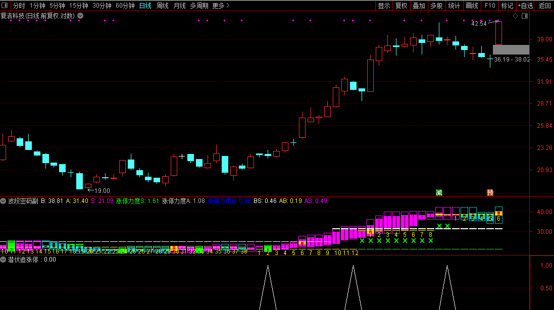 波段密码副图这是一个给炒股老手用的“K线增强插件”。它会把普通的K线图重新“化妆”,用更醒目的颜色告诉你现在是强势还是弱势——紫色代表主力在拉,蓝色代表力道不够。它会自动算出三根关键的生命线(B线、S线、A线),就像在地图上标出重要的战略高地。碰到涨停板时,它会放个彩色烟花提醒你;当股价在这些关键线附近徘徊时,它会用数字和图标悄悄提示你该关注了。本质上,这就是个帮你看透盘面语言、抓住关键转折点的智能放大镜。