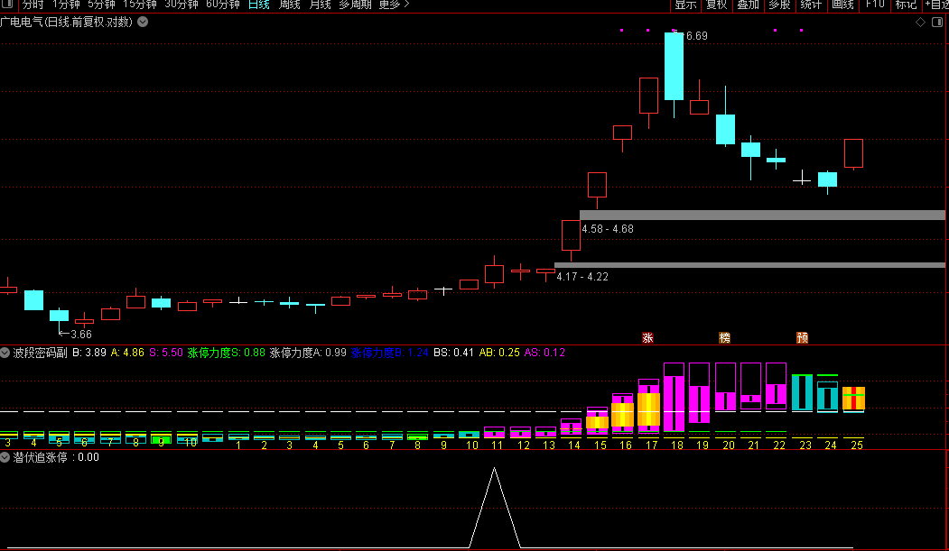 潜伏追涨停副图它寻找的是刚刚启动突破的强势股。公式的核心是要求股票同时满足多个条件:首先股价要突破两个关键的计算价位(一个是基于四根K线包含关系算出的支撑位,另一个是基于近期价格区间算出的压力位);其次短期均线系统要整体站上长期均线之上,形成支撑;同时短期趋势指标必须向上,并且开盘价的平滑角度连续两天强势。此外,股票在近期要出现过特定的底部形态,并且在过去一段时间内经历过充分的蓄势整理。简单说,这个公式就像一张“多条件通行证”,只有那些价格突破、均线支撑、趋势向上、形态到位且经过蓄势的股票才能被筛选出来,目的是捕捉高确定性的上涨起点。