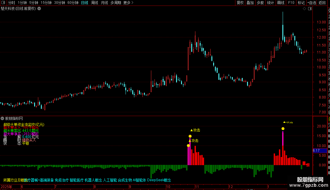 指标主要用于实时监控市场中超级大单资金的流向与活跃程度,通过识别大额成交是否伴随价格上涨,判断主力资金是积极进场还是出逃。它不仅统计累计净流入/流出金额,还结合近期量能基准,评估当前资金动作是否异常,并据此划分攻击强度和资金状态。图表上用不同颜色柱体直观显示买卖力度,同时标注“强势攻击”“连续流入”等关键信号,辅助判断短期多空动能。