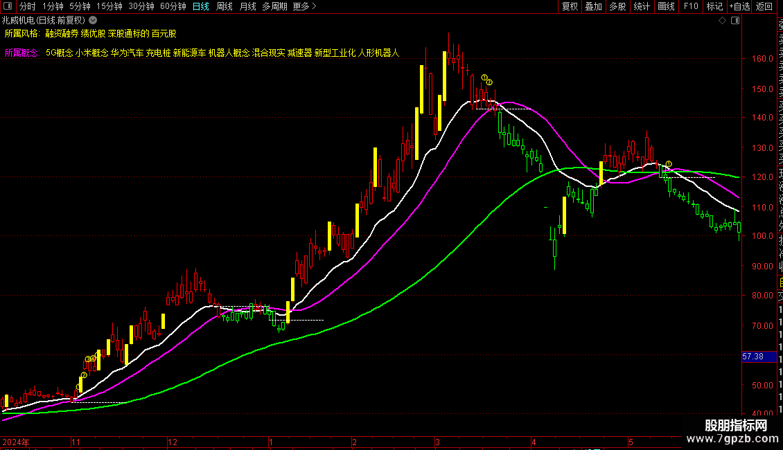 DRAWTEXT(REF(短线快枪,3) AND C>REF(L,2) AND REF(REF(短线快枪,2) AND C>REF(L,1),1) AND XXX,H*1.01,'③'),COLORYELLOW;