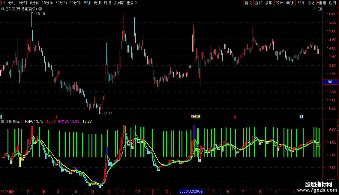 多空线:(20*X+19*REF(X,1)+18*REF(X,2)+17*REF(X,3)+16*REF(X,4)+15*REF(X,5)+14*REF(X,6)