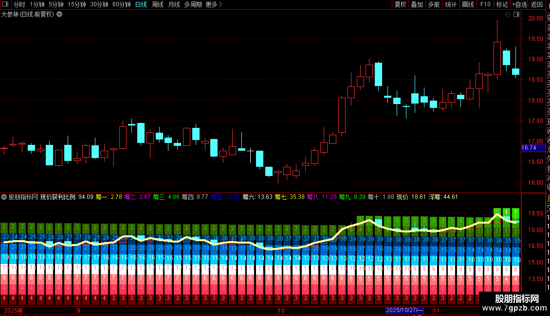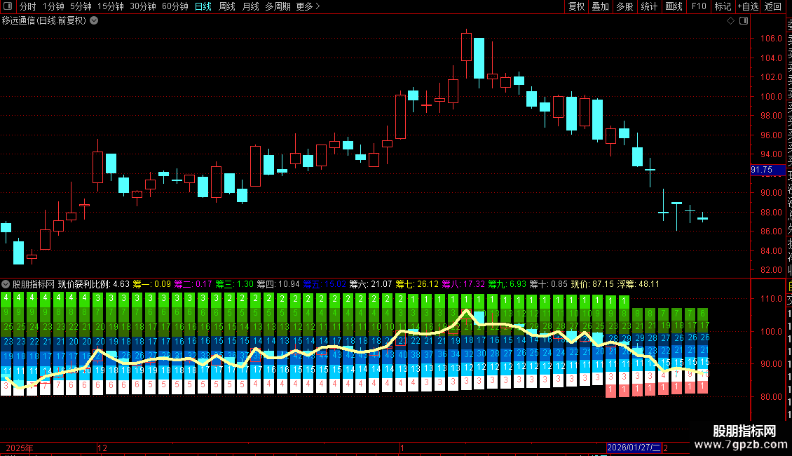 筹码分布是一种能观察筹码动态变化的副图指标。重点提示——安装前务必使用前复权处理数据以避免错误。主界面由三色区域构成:红色区域代表低位筹码聚集区,蓝色区域属于震荡换手区,绿色区域对应高位套牢盘。关键要关注中间的数字序列,其波动直接反映各价位筹码占比的变化。