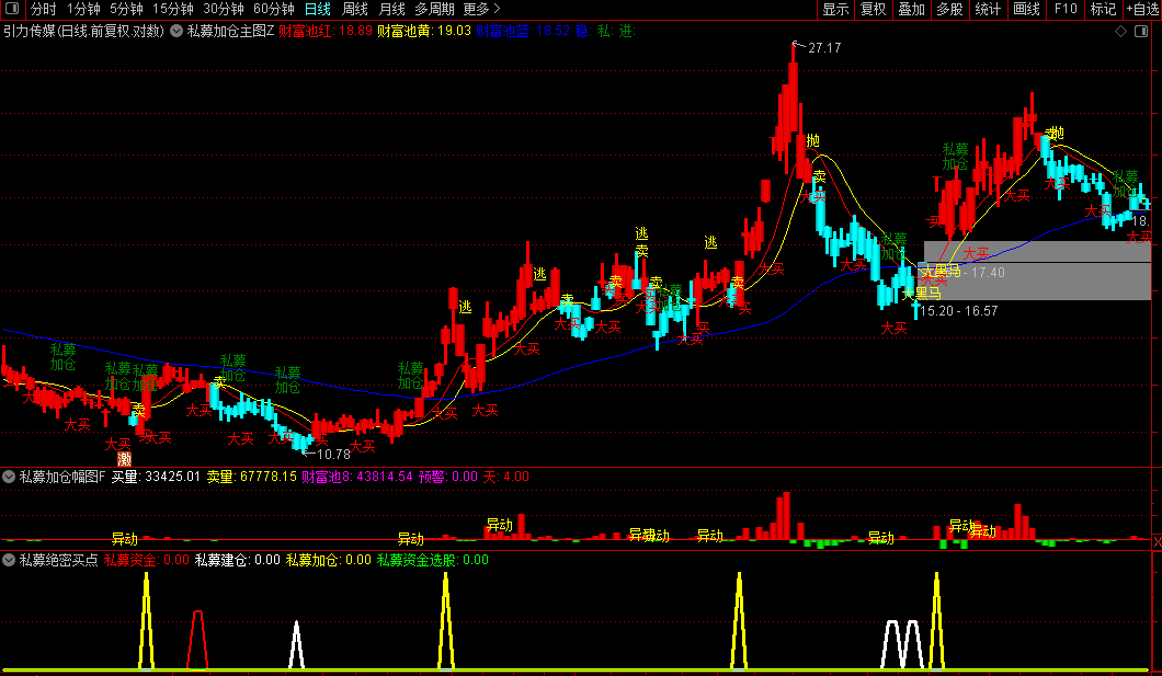 用法:黄色“私募加仓”信号出现,通常意味着股价可能开始一波强势上涨,是追涨或加仓的信号。但需注意追高风险。