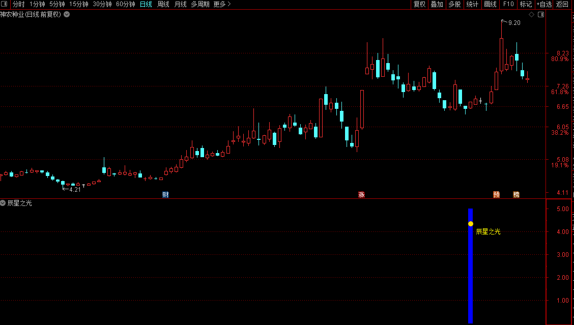 当以上所有条件同时满足时,副图上就会在对应K线位置出现蓝色的柱状标记和“辰星之光”的文字提示,非常醒目。