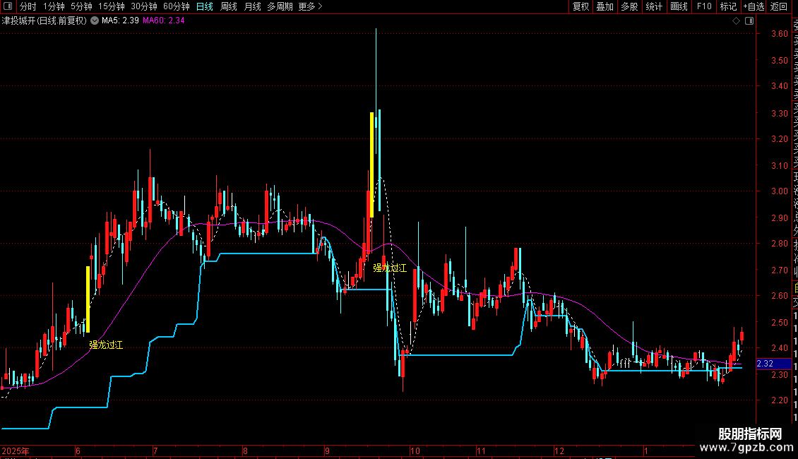 1 强龙过江主图指标中 白色虚线代表短线5日线 紫色线代表主力成本线 青色线代表短期成本线 当白色5日虚线上穿紫色主力成本线时 表示短线走强 是重要的股票技术分析信号