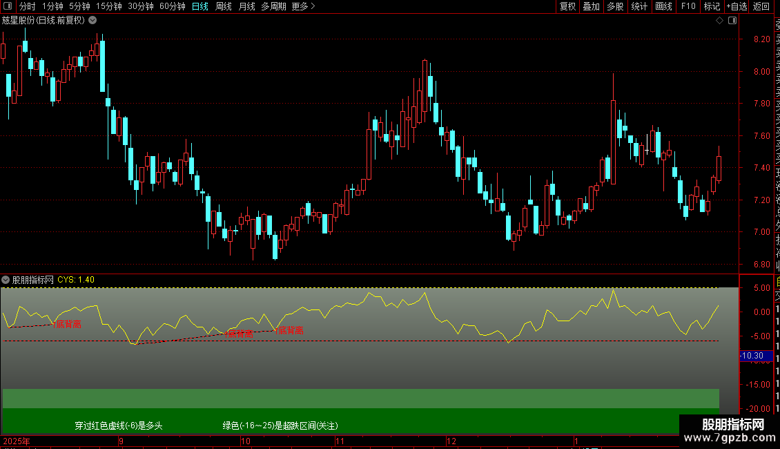 DRAWTEXT_FIX(C>0,0.1,0.90,0,'穿过红色虚线(-6)是多头'),COLORWHITE;