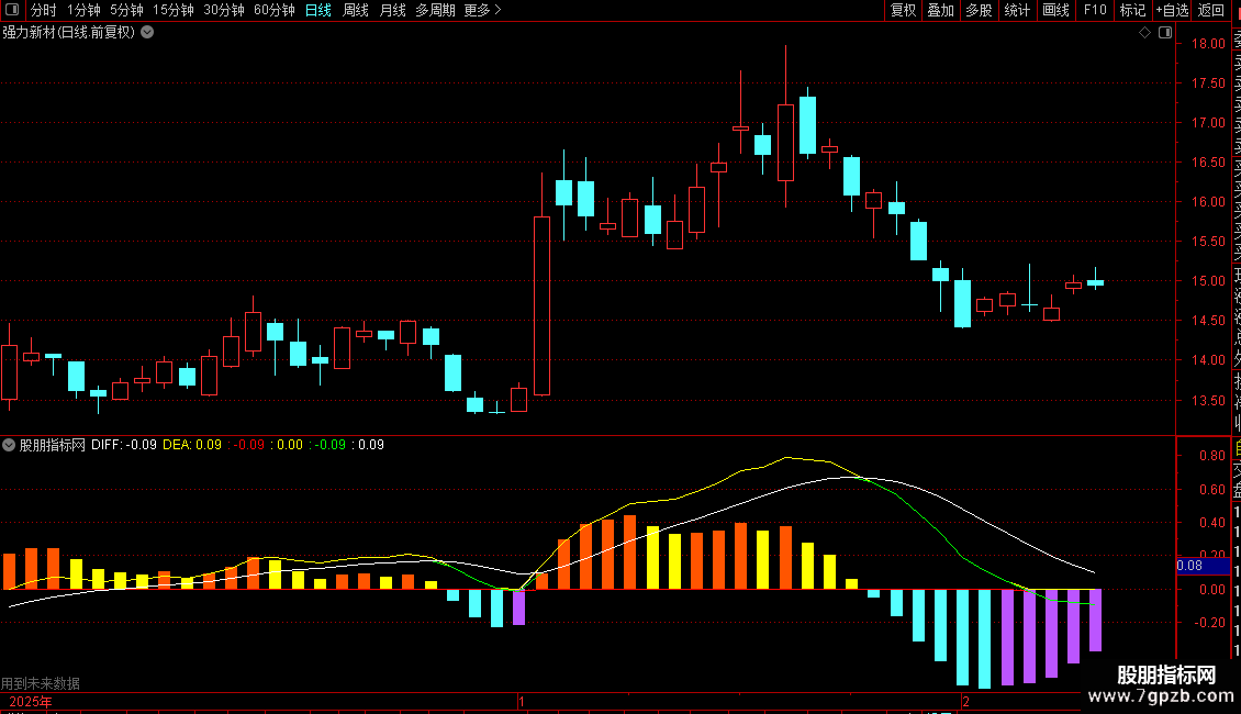 4、在下跌行情中,绿柱的出现表明个股处于下跌趋势,此时不宜介入。当绿柱达到最大时,往往预示底部临近;而紫色柱状图的出现,则说明个股反弹行情开始,这正是利用该指标进行操作的介入时机。掌握这些股票技术指标分析要点,能帮助投资者更有效地把握买卖点。