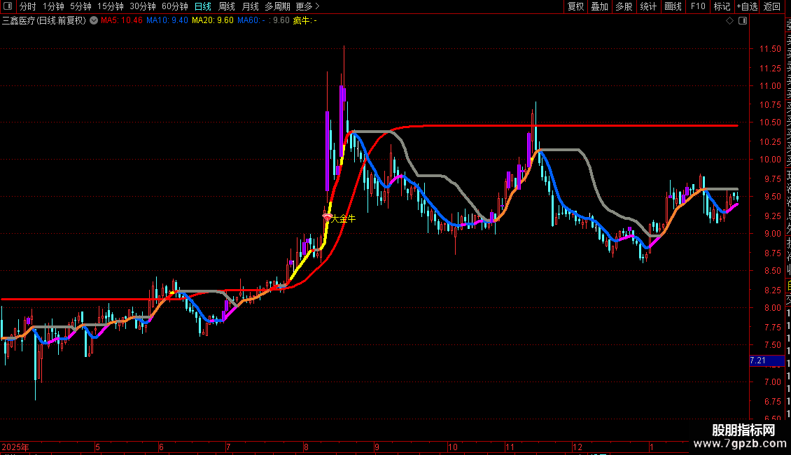 疯牛线:EMA(HHV(集,21),6),COLOR0000FF,LINETHICK3;