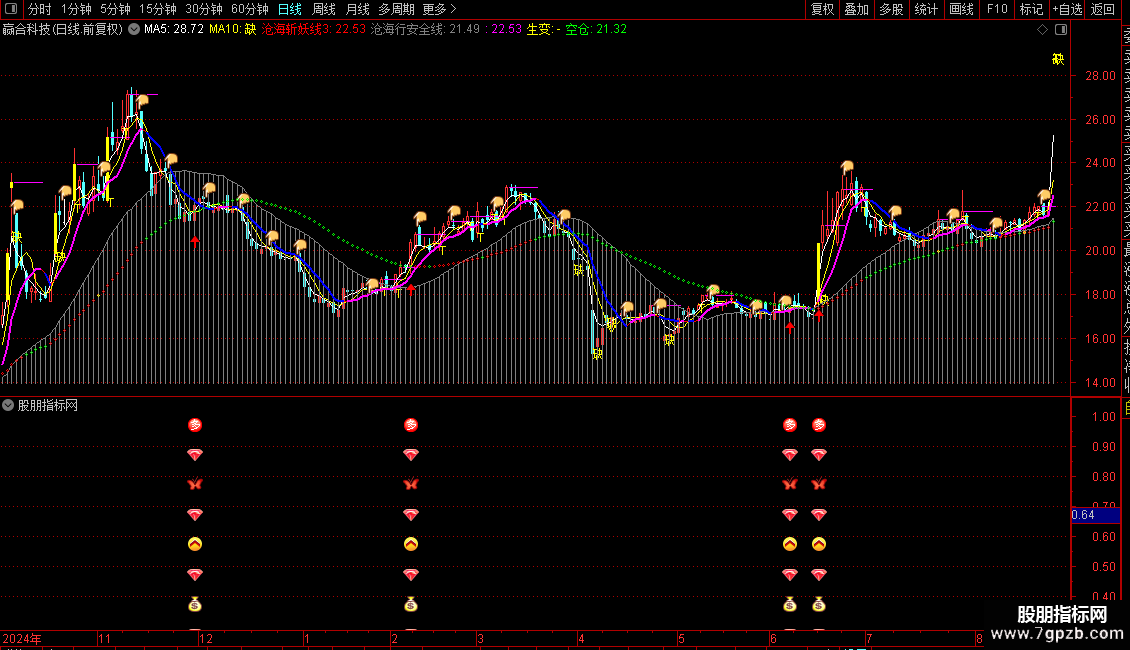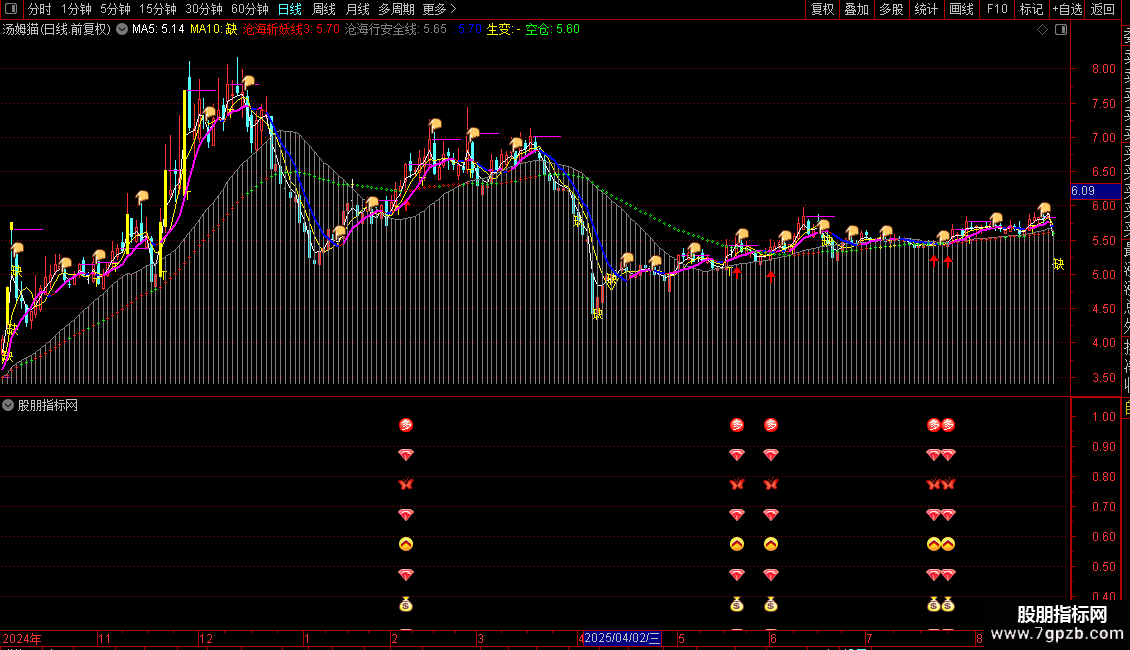 指标通过多周期加权均价构建一条平滑的“趋势中枢线”,并结合短期价格与该中枢的交叉关系,判断潜在的中短线入场时机。当股价由下向上有效穿越中枢线时,视为多头信号,系统会密集提示“沧海入场”图标,强调趋势可能转强。同时辅以价格行为、均线方向和资金成本变化,过滤虚假信号。