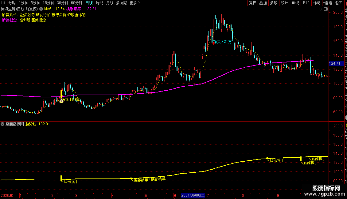 换手吸筹1:=EMA(X_2,200)*1.118 ,LINETHICK2,COLORMAGENTA;
