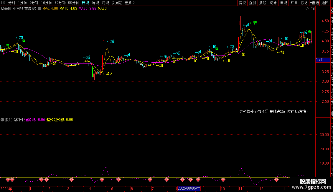 1. 主图公式:加载后显示5日、10日、30日均线,并自动标注“加”“减”“买入”“清”等文字提示。当出现“超预期”信号时,表明股票可能进入加速阶段,可重点关注。