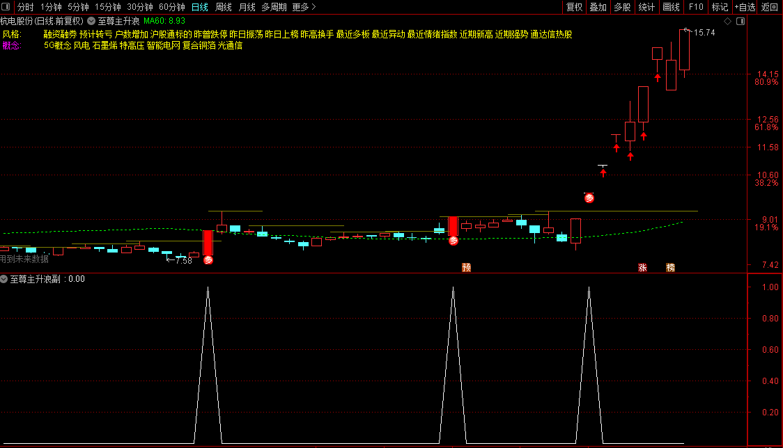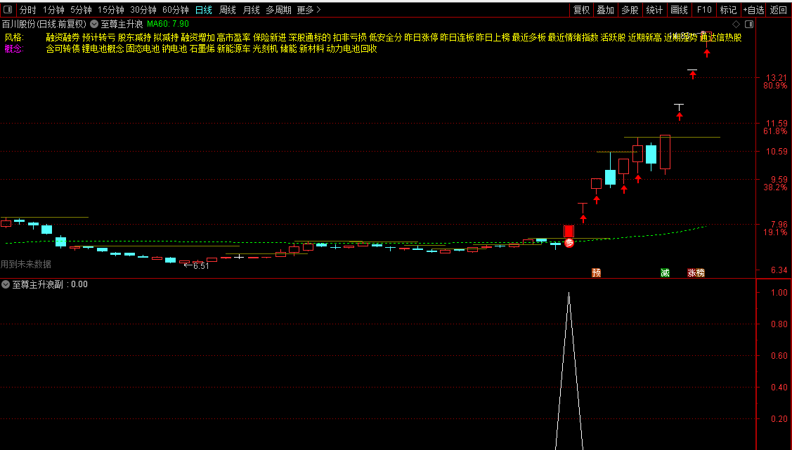 主图通过布林通道、均线、动量、KDJ、RSI、LWR、MACD等多重公式共振,叠加涨停识别与价格突破逻辑,在K线上直观标注潜在主升浪启动信号(图标+红色K线高亮)。