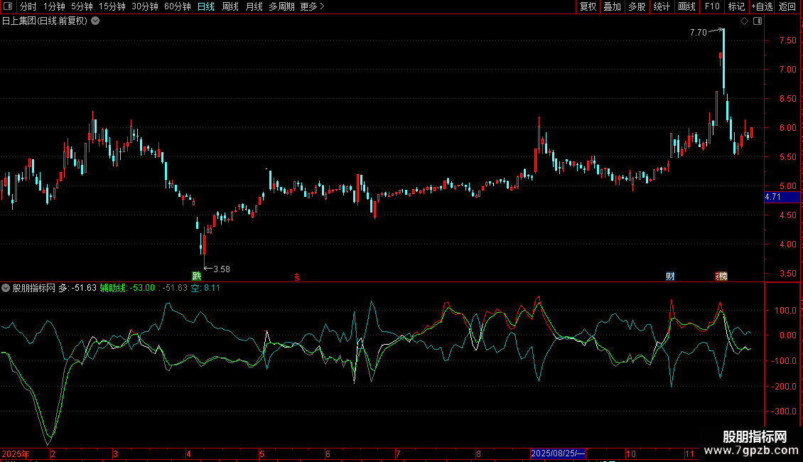“辅助线”可用于跟踪“多”指标的趋势,金叉死叉可作为辅助参考。
