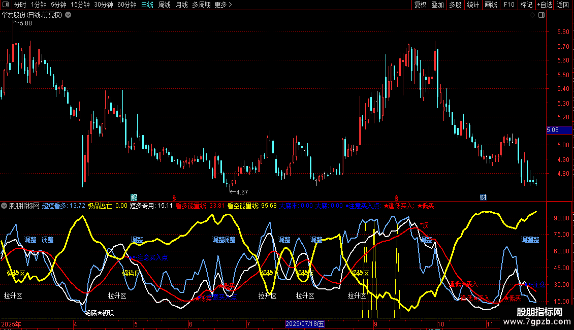 ★低买: 在“短多专用”线上穿“看多能量线”发生的下一个交易日,若短期线显著高于多头线,则标记“★低买”。这两个信号均提示回调后的买入机会。