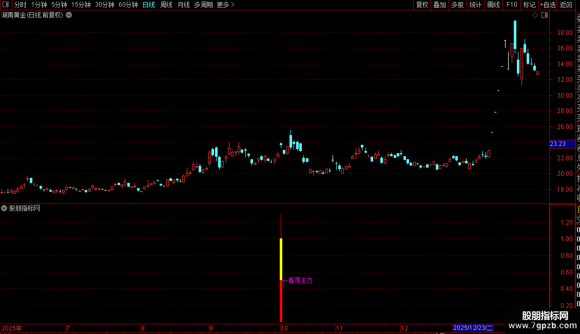 指标通过分析筹码分布与价格关系,识别主力资金可能介入的时机。核心逻辑是对比当前获利盘与近期价格波动区间的筹码集中度,当股价处于短期均线上方、主力筹码优势显现且排除涨停干扰时,发出“看穿主力”信号。适用于捕捉主力吸筹初期的低风险买点。