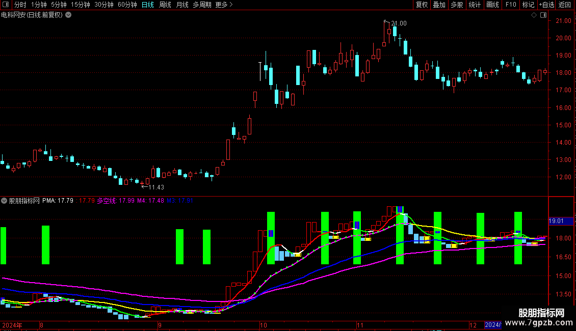 多空线:(20*X+19*REF(X,1)+18*REF(X,2)+17*REF(X,3)+16*REF(X,4)+15*REF(X,5)+14*REF(X,6)