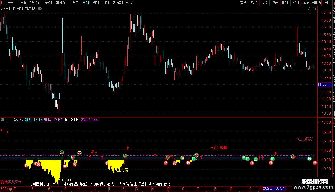 分时主力吸筹是一款适配通达信的分时主图指标,核心围绕资金动向与价格支撑阻力展开分析。指标先通过当日开盘价、最高价、最低价等数据计算出阻力位、支撑位和中位线,直观展示价格运行区间;同时拆分不同量级成交额的买卖情况,实时统计机构买入/卖出占比并标注在界面,还附带个股所属行业、地域、概念板块信息。