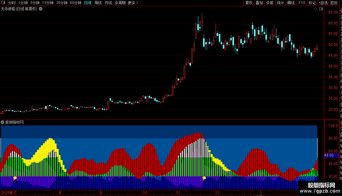2. 多指标共振验证:KDJ指标的D线与ADXR线的柱体对比为关键共振信号——红色系柱体(D>ADXR)代表多头动能占优,蓝白色系柱体(D<ADXR)代表空头动能占优,柱体形态越明显,动能共振越强。