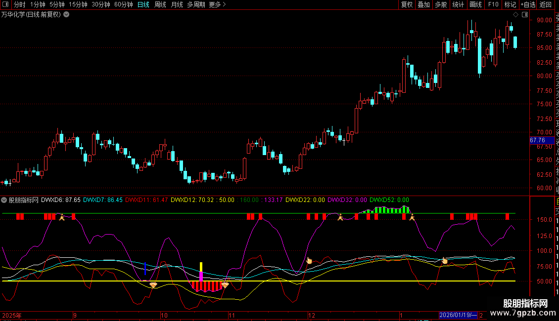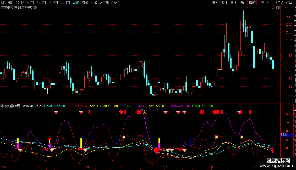 1. 区间判断:50(黄色粗线)为强弱分水岭,160(绿色粗线)为超买线。指标线(DWXD17,紫红色)上穿50出现红色图标,提示转强可逢低布局;下穿160出现绿色图标,提示超买回落,宜减仓。