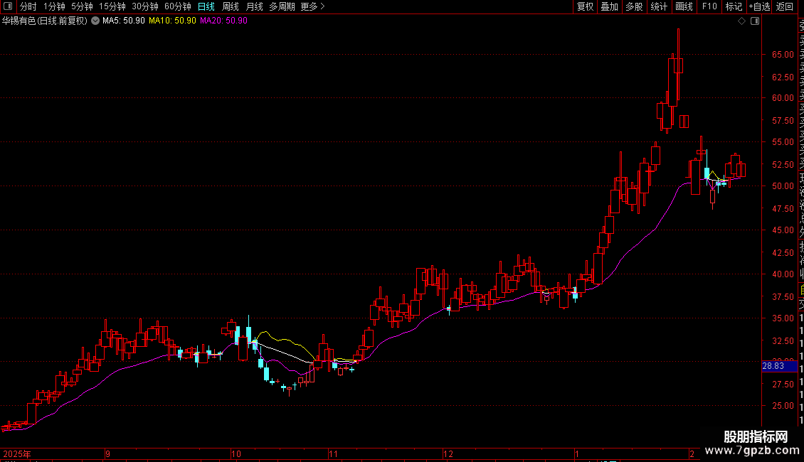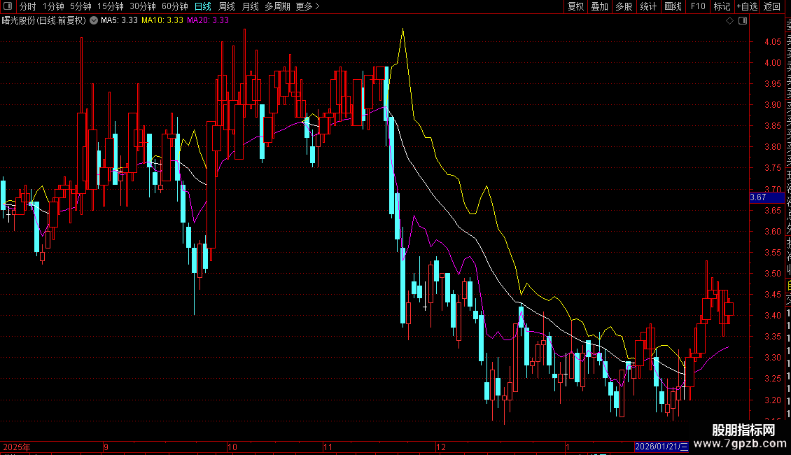 1、势(白色线):代表股价走势,作用等同于分时图中的黄色均线。