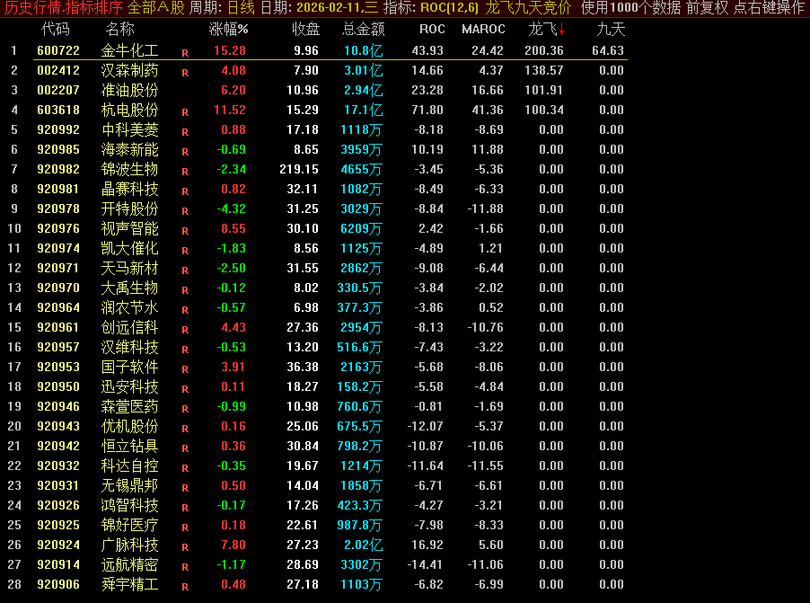 通达信【龙飞九天】竞价排序指标 9点25分开始排序排序参考第一支源码