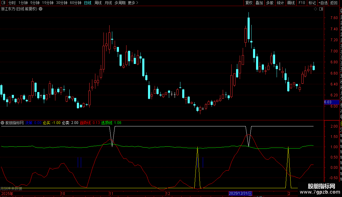 必买:使用TROUGHBARS函数寻找最近一个满足条件的波谷位置。若当前是波谷(结果为0)且最高价大于最低价加0.01,则输出1,否则输出-1。以黄色细线显示。
