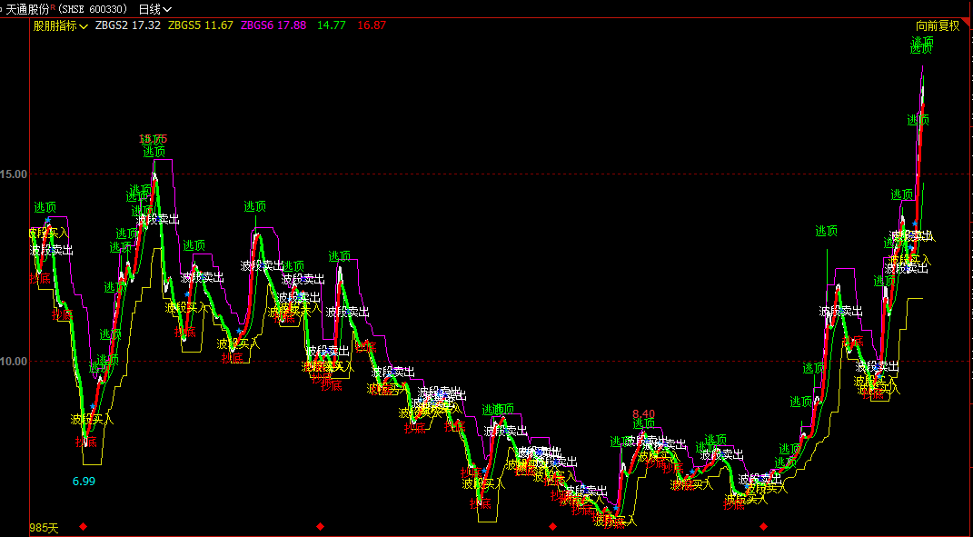 公式核心构建三重信号层:首先,以加权价格(结合开盘、最高、最低、收盘)计算5日基准线及±3%通道,并辅以21日高低点轨道,初步界定价格波动区间。其次,引入加权移动平均线(ZBGS8)与三重指数平滑线(ZBGS9-ZBGS11)的交叉机制,当快线上穿慢线时,在K线低位标记“波段买入”及星号提示;反之则在高位标记“波段卖出”,直观标示趋势转折点。最后,通过复合动量指标(ZBGS12)监控超买超卖状态:当指标上穿21.11时触发“抄底”信号,下穿78.89时则发出“逃顶”警示,有效规避极端风险。此外,公式还通过三重平滑均线(ZBGS14)与短期均线(ZBGS15)的对比,以红绿粗线动态显示短期趋势强度,强化视觉跟踪。