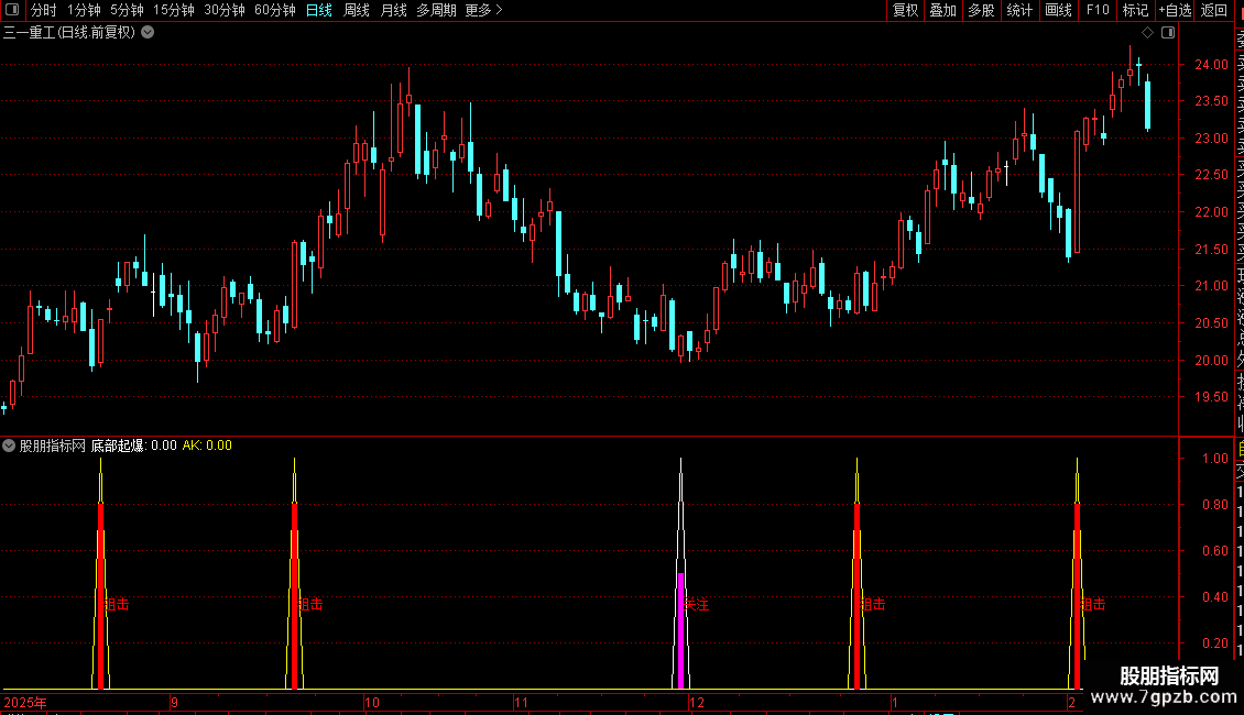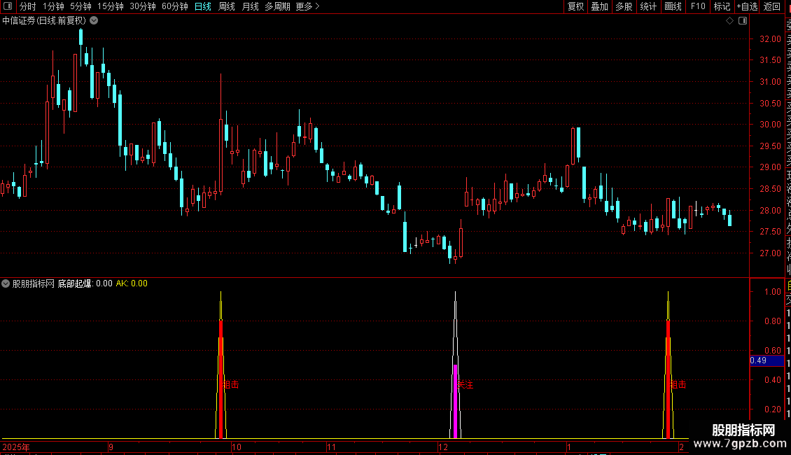 使用方法:加载至通达信副图。当指标在低位出现红色的“关注”或“狙击”信号柱时,表明个股可能处于起爆临界点,可结合趋势与盘面情况予以重点关注。