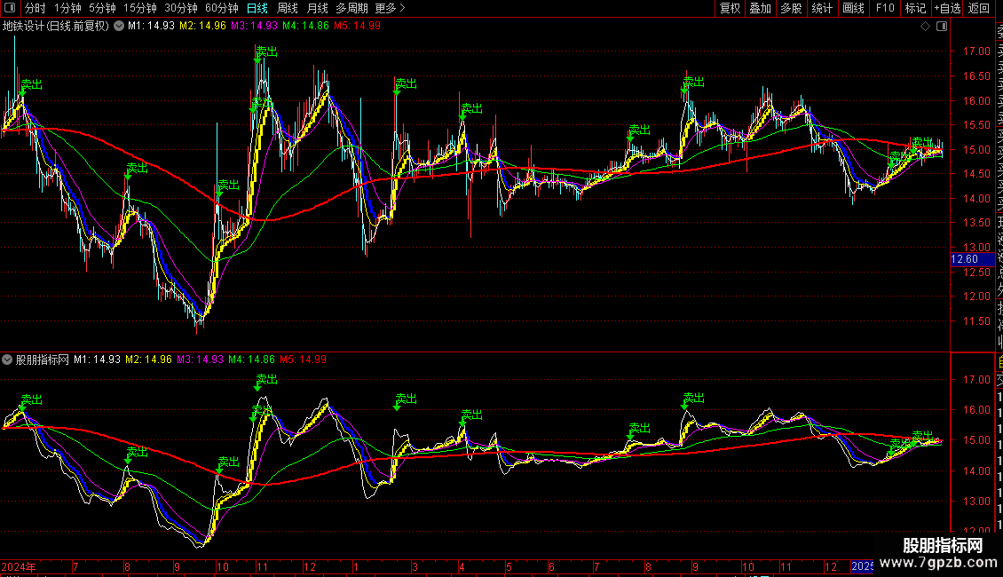 长期红色均线`M5`是重要的趋势过滤器。当价格运行于`M5`之上时,可侧重关注买入信号;当价格运行于`M5`之下时,卖出信号和风险控制的权重应增加。