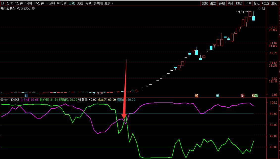 主力线上穿散户线即为买点主力线一旦在80之上运行就一直持有做大波段最好用大牛股起爆指标珍藏多年无私奉献。