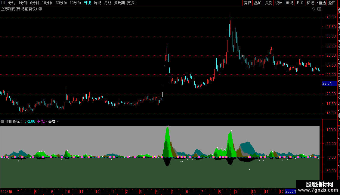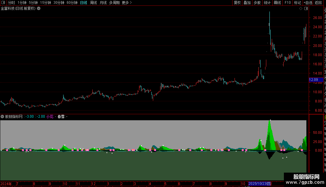 注意:指标信息高度密集,需结合价格走势综合判断。信号点(小花、春雪)仅为特定计算条件下的标记,并非直接的买卖指令。