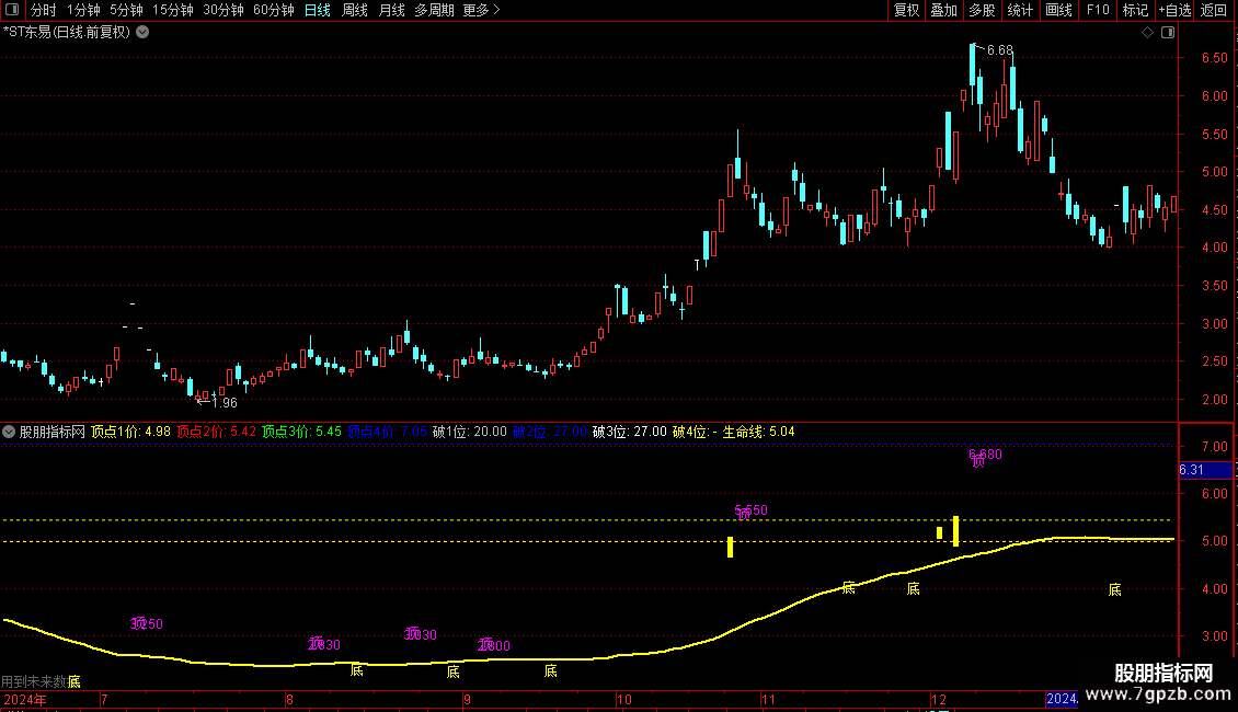 主图K线:会出现“顶”、“底”文字标记,以及在高位绘制的四条水平阻力线。当价格突破阻力线时,K线或特定标记会变为黄色。