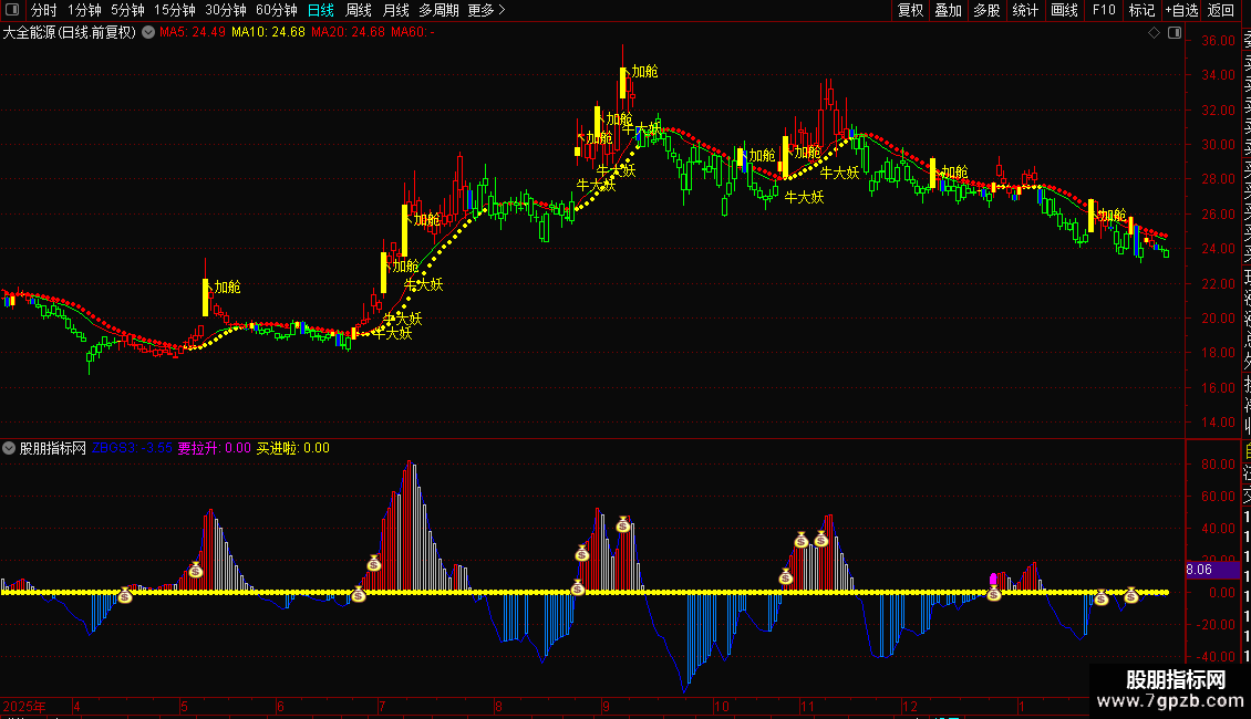 1. 主图:红K线持股、绿K线持币,出现“启动点”可建仓,“连板”“牛大妖”信号可加仓,“加舱”提示趋势延续;